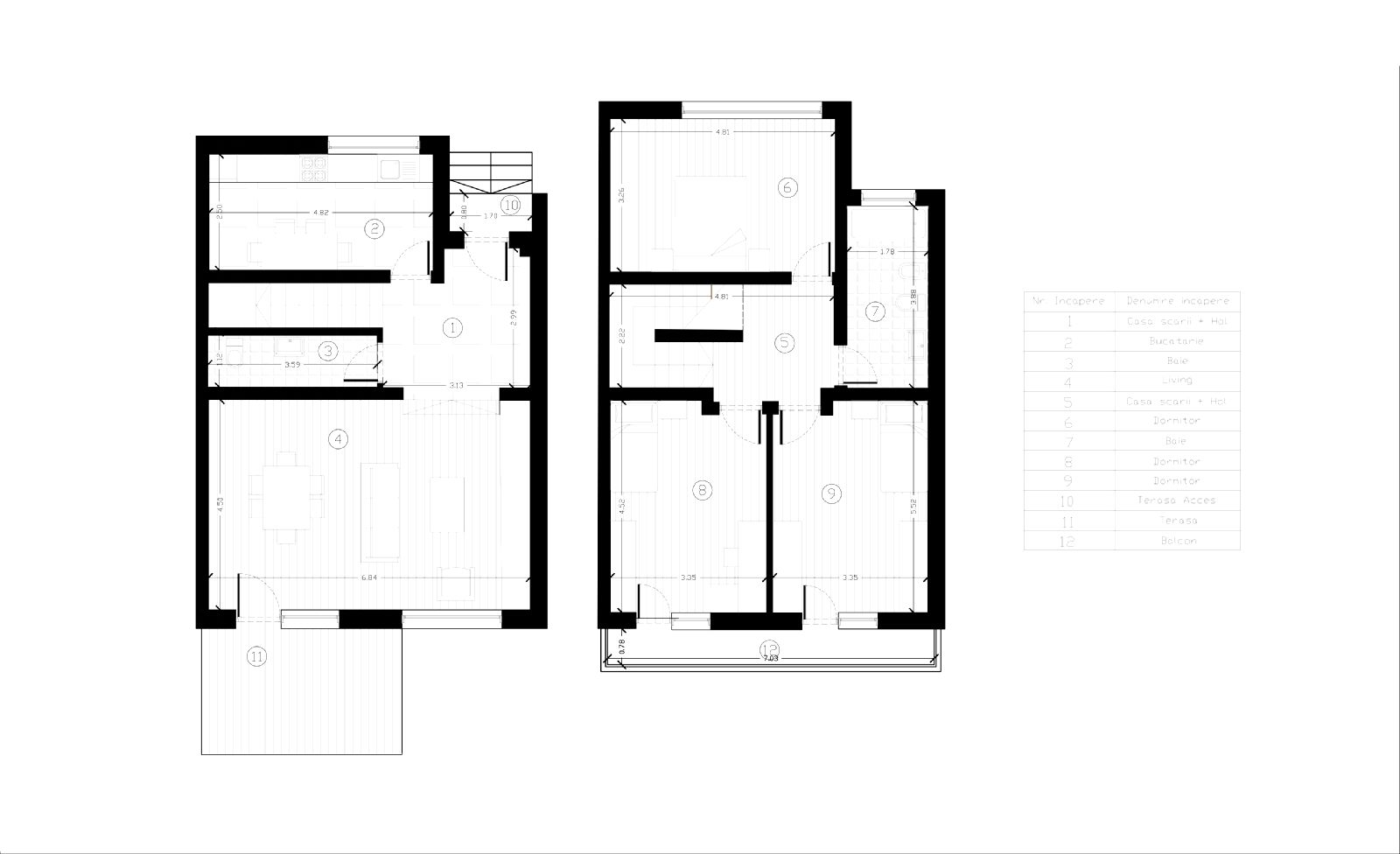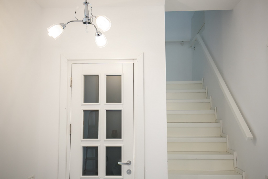 uși interioare din lemn masiv (nuanță la alegere) și scară interioară din beton cu trepte placate cu lemn de culoarea ușilor.